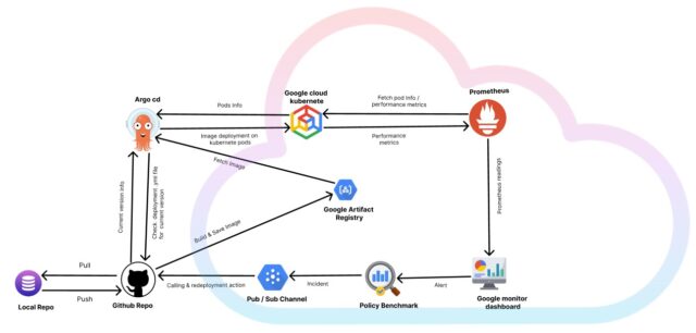 This project delivers an end-to-end automated MLOps–GitOps pipeline for a housing‐price prediction service: a Decision Tree model is trained in Python and packaged into a FastAPI application, which is containerized via Docker and pushed to Google Artifact Registry. A GitHub Actions workflow builds the Docker image (tagged by run number), updates the Kubernetes Deployment manifest in Git, and ArgoCD automatically syncs those changes to a three-node GKE cluster—ensuring zero-touch rollouts and self-healing via liveness/readiness probes. Meanwhile, the model’s performance is continuously monitored (using Prometheus metrics for request count, latency, and accuracy), and when accuracy falls below a threshold, a retraining workflow is triggered that commits the new model artifact back to Git. This, in turn, dispatches the CI/CD pipeline again, rebuilding and redeploying the updated container—all under GitOps control for full auditability and resilience.